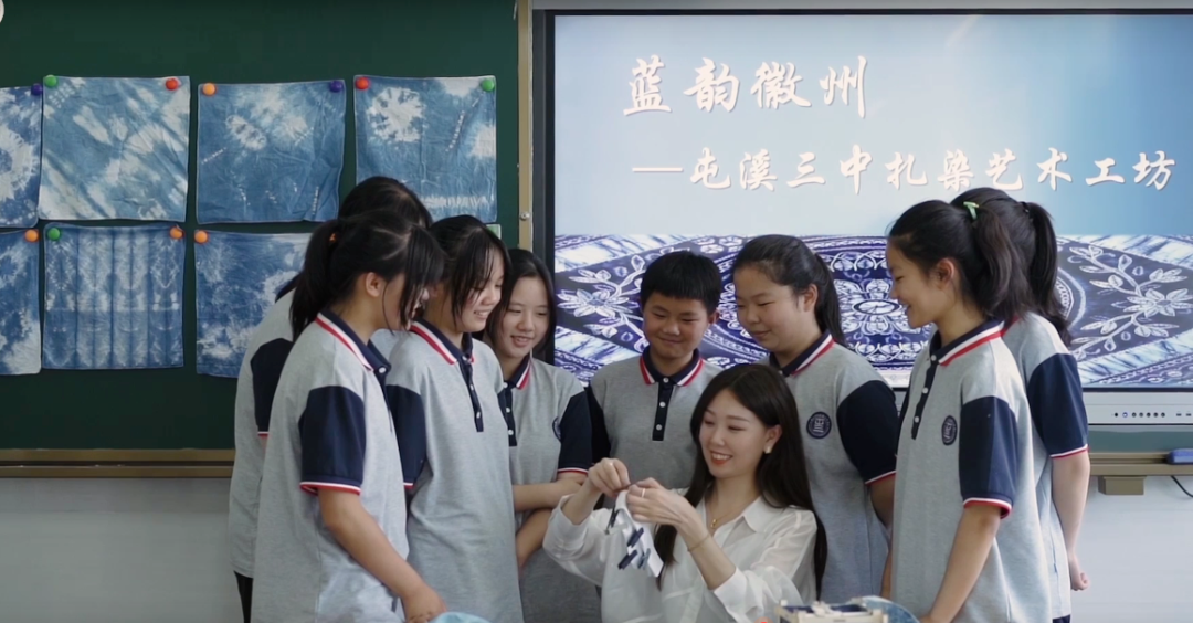图为屯溪三中组织学生在美术室学习民间扎染艺术