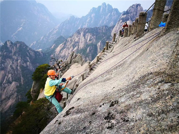李培生承担的是黄山风景区的环卫放绳工作。每日,第一批游客还未上山,李培生便会开始放绳工作。放绳、弯腰、捡拾,李培生每天都要在悬崖上放绳4到5次,20余年来放绳高度相当于攀爬了200座珠穆朗玛峰。