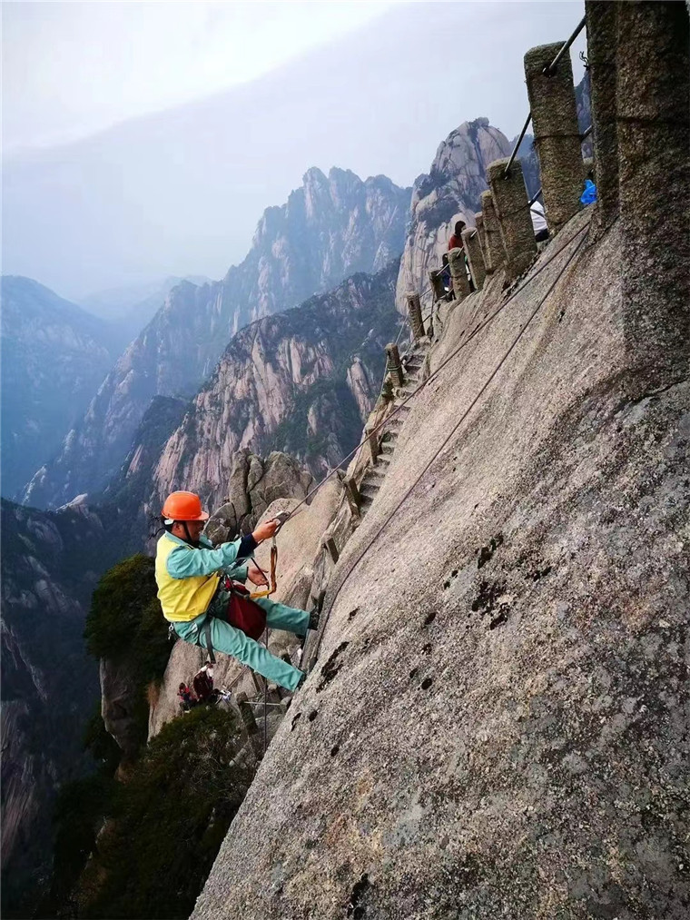 放绳工作本就是危险作业,在工作中不小心双脚踩空在空中晃荡、被大风刮来的砂石擦破皮是常有的事情,而李培生负责的区域坐落着黄山风景区的最高峰莲花峰和最为险峻的天都峰,这都给他的体力和心理素质带来了极大的考验,但李培生从没退缩过。随着工作经验的积累,李培生摸索出了一套安全有效的放绳工作法。