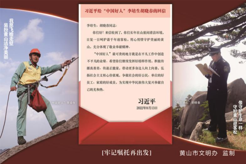 2022年8月13日,中共中央总书记、国家主席、中央军委主席习近平给黄山风景区工作人员李培生、胡晓春回信,对他们继续发挥“中国好人”榜样作用提出殷切期望,勉励他们积极传播真善美、传递正能量,带动更多身边人向上向善。黄山大地好人不胜枚举,包括李培生、胡晓春等在内的一批批道德模范和身边好人,如星光般耀眼,又如你我一样平凡。他们或助人为乐,或孝老爱亲,或见义勇为,或诚实守信,或敬业奉献,用凡人善举为黄山奋力崛起赶超提供了强大精神动力、丰润道德滋养。