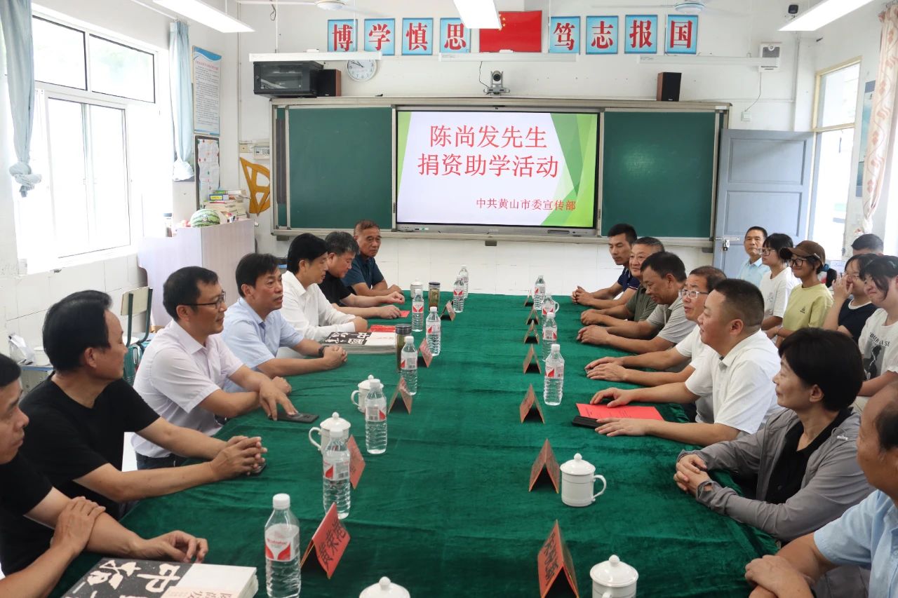 8月22日,“安徽好人”陈尚发走进歙县街口中心学校,开展捐资助学活动,为该校9名考上大学、高中及表现优异的学生发放助学金,并鼓励他们刻苦学习、成长成才。市委宣传部副部长、二级调研员胡武军出席了捐助仪式。