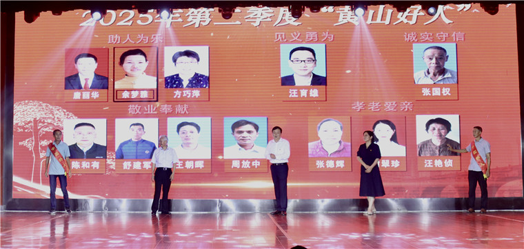 活动现场,揭晓了2025年第二季度“黄山好人”榜单。经逐级推荐、网友评议、专家评审等环节,唐丽华等12人当选2025年第二季度“黄山好人”。他们中有十年如一日坚持志愿服务的方巧萍,有十余年守护瘫痪婆婆的村民张德辉,有勇救落水群众的村医汪育雄,有扎根基层四十余载的村民张国权,有深耕教学一线的教师周放中……他们用善行义举共同书写了新时代的动人篇章,展现了黄山人民崇德向善的精神风貌。