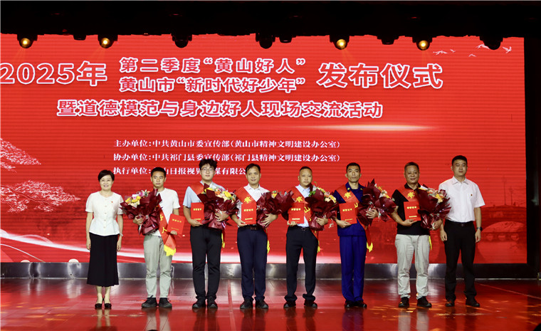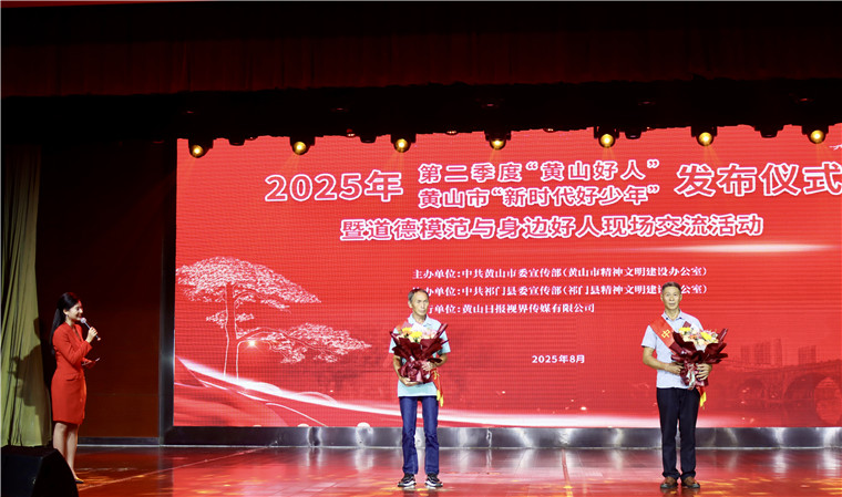 8月30日,2025年第二季度“黄山好人”、黄山市“新时代好少年”发布仪式暨道德模范与身边好人现场交流活动在祁门县举行。市委常委、副市长王恒来出席活动。