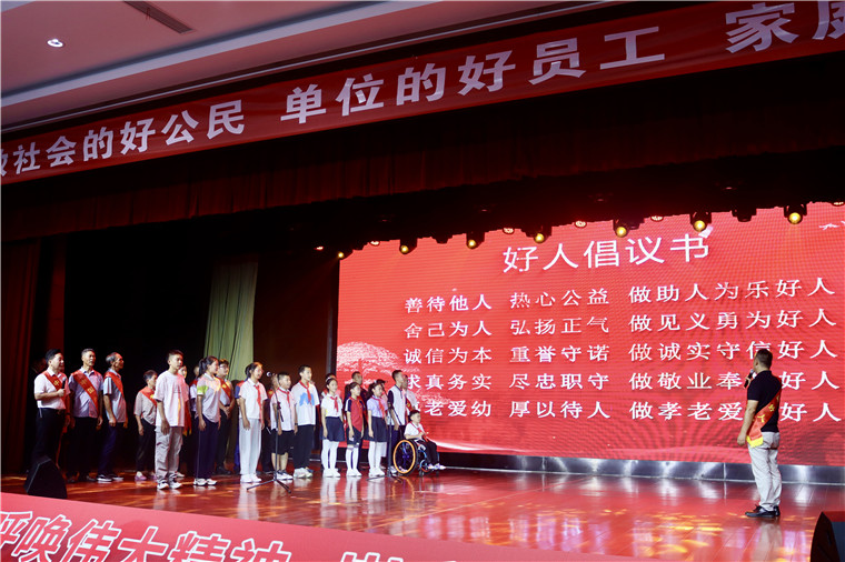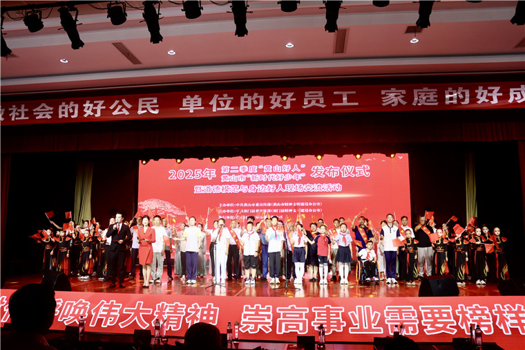 最后,2025年第二季度“黄山好人”、黄山市“新时代好少年”与受邀道德模范、身边好人代表一起宣读了《好人倡议书》,全场齐声高唱《歌唱祖国》,将活动推向高潮。活动在庄严而温暖的氛围中圆满落幕。