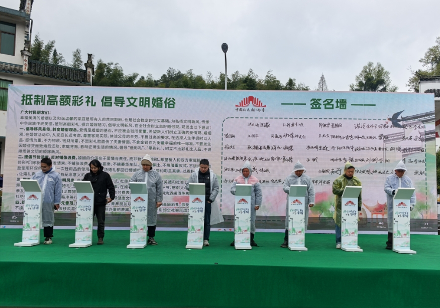 活动在优美的朗诵《春风里的新清明》中拉开序幕。活动现场,休宁县与浙江省开化县齐溪镇、江西省婺源县江湾镇、江西省婺源县溪头乡联合发布《红白喜事操办倡议》,从彩礼数额、酒席规模等多个方面提出了明确具体的倡议,引导群众抵制大操大办、铺张浪费等不良风气,树立健康、文明、节俭的婚丧观念。休宁县21个乡镇及齐溪镇、江湾镇、溪头乡红白喜事牵头负责人共同发出承诺,以实际行动影响身边人,深入推进移风易俗。