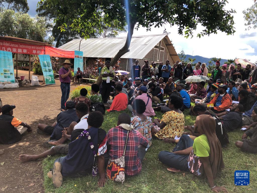 中国援巴布亚新几内亚菌草旱稻项目专家组组长林应兴(戴草帽者)在巴布亚新几内亚东高地省中国援助巴新菌草和旱稻技术项目第9期培训班上授课(2020年12月15日摄)。新华社发