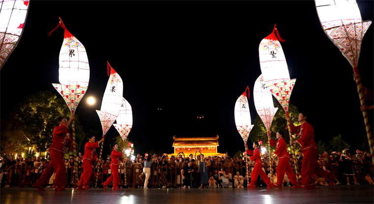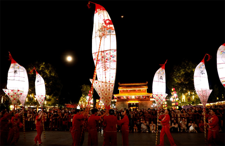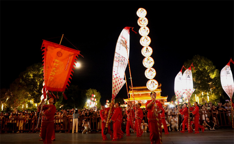 8月7日晚,歙县许村镇许村村20多位女农民进城表演“许村大刀灯”,助兴徽州古城非遗夜生活,吸引游客夜游古徽州。