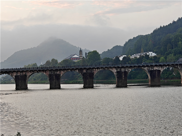 9月13日,歙县太平桥横卧练江,长庆寺塔影倒映水中,塔影桥身与粉墙黛瓦相映成画。据了解,丰乐、富资、布射、扬之四水汇流练江,与渐江合并成了新安江,太平桥、万年桥、紫阳桥等古桥众多,与层叠错落的徽派民居、若隐若现的群山,构成了一幅美丽的新安山居图。