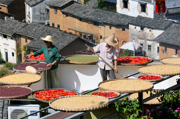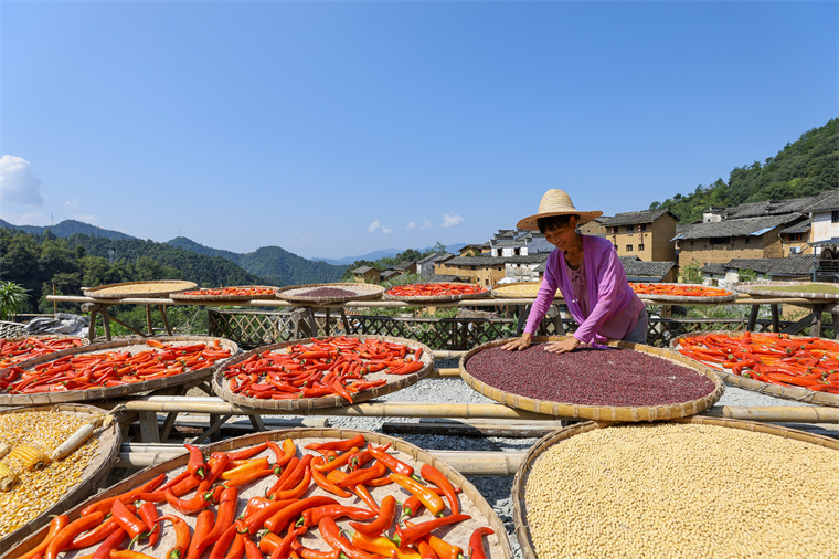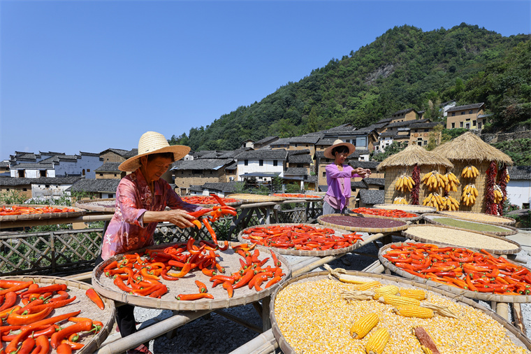 9月17日,歙县深渡镇的阳产村迎来一年中最绚烂的时节。层层叠叠的徽派土楼群依山而筑,黛瓦黄墙的古老民居间,村民们正将新收获的玉米、辣椒、红豆、南瓜铺展在圆匾竹筛中,晾晒于房前屋后、窗台屋顶,宛如一幅天然挥就的秋日油画。