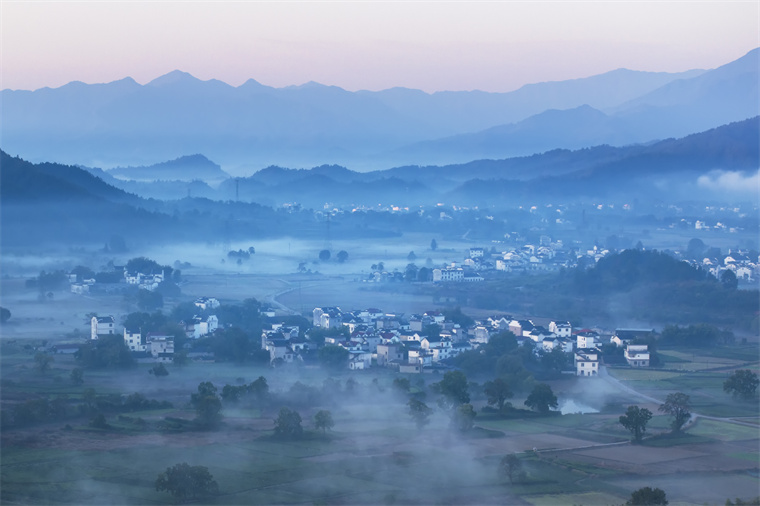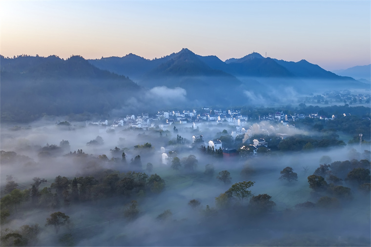 10月29日,休宁县商山镇溪洲村晨雾缥缈,色彩斑斓的乌桕树与徽派民居、山川 、田园在晨雾中相映成景,组成一幅深秋和美乡村画卷。