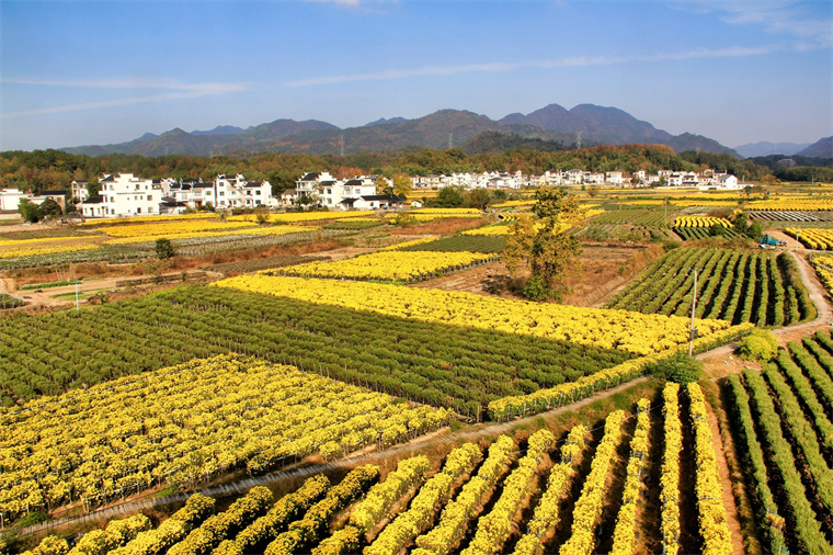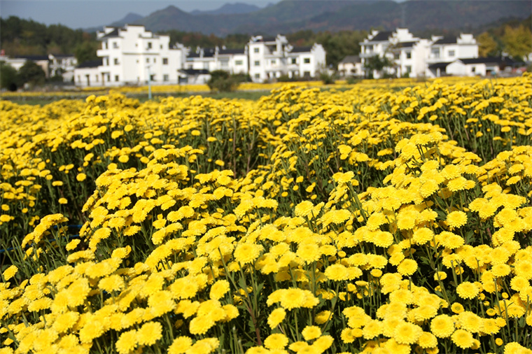 初冬时节,阳光明媚,徽菊之乡休宁县海阳镇盐铺村千亩金色的菊花进入盛花期,如同铺展开的一幅流金溢彩的丰美画卷。极目眺望盐铺村,蓝天白云之下,五彩斑斓的远山,或黄或绿的菊田,白墙黛瓦的村庄,构成了一幅唯美壮观的乡村画卷。