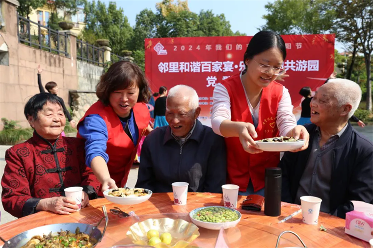 龙西社区位于老城区,辖区老年人口众多,不少老年人退休后积极加入到社区的文明实践队伍中。正是因为他们把文明实践志愿服务当成他们退休后新的事业,参加后有满满的充实感与成就感,成为他们夕阳红生活中不可或缺的一部分,“银龄百家宴”项目便应运而生,让老人有一个相互切磋厨艺、文艺展示的平台,在“食全食美”的喜庆氛围中庆祝重阳佳节。
