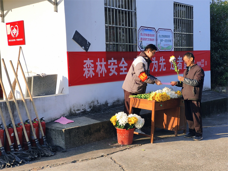 在奕棋镇占川村公墓,工作人员和志愿者们在出入口摆放白菊花和黄菊花,“您好!我们正开展鲜花换香纸活动,您手中的鞭炮、纸钱等祭祀用品可以换上鲜花……”在公墓现场,奕棋镇镇村干部正在用鲜花换取前来祭祀群众手中的香烛和纸钱,倡导以鲜花寄托哀思,以此表达对故人的思念、感恩和敬仰。据悉,该镇共设置志愿服务点8个,采购3500枝鲜花用于祭祀用品回收兑换。