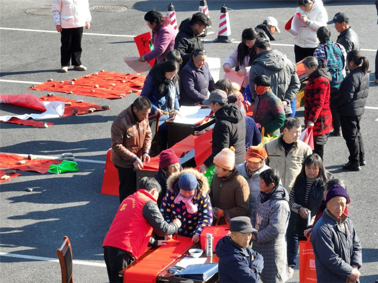 活动期间,新时代文明实践中心书法志愿者们挥毫泼墨,大展身手,压纸、沾墨、起笔、收笔,一起一落间一幅幅充满吉祥喜庆、蕴含浓浓年味的春联跃然纸上。周围群众一边观摩,一边挑选自己喜欢的春联,刹那间,红春联便铺满了大半个广场,整个现场都充满着迎新春的喜气景象。