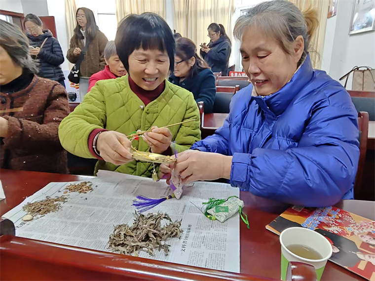 讲解结束后,活动进入了倍受期待的动手制作环节。在仰老师的悉心指导下,居民们兴致盎然地开始了自己的香囊制作。从辨别药材、按比例混合,到小心翼翼地装入香囊,最后进行缝制或系绳装饰,每一个步骤大家都做得认真专注。不一会儿,一个个独一无二、药香沁脾的平安香囊便在居民手中诞生了。亲手制作的体验,不仅让大家学到了实用技能,更将一份健康祝福“袋”回了家。