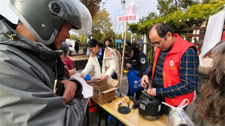 “邻帮有我”惠民服务区。这是最贴近居民日常生活的区域——城南党支部的修鞋摊位前,志愿者正专注地为老人修补开胶的旧鞋,打磨、上胶、缝线动作娴熟,不一会儿就让旧鞋恢复了原样;万住物业党支部的义剪摊位前也排起了小队,志愿者耐心询问每位居民的需求,细致修剪发丝,剪完头发的老人们对着志愿者竖起大拇指,温暖的互动让整个区域充满温情。