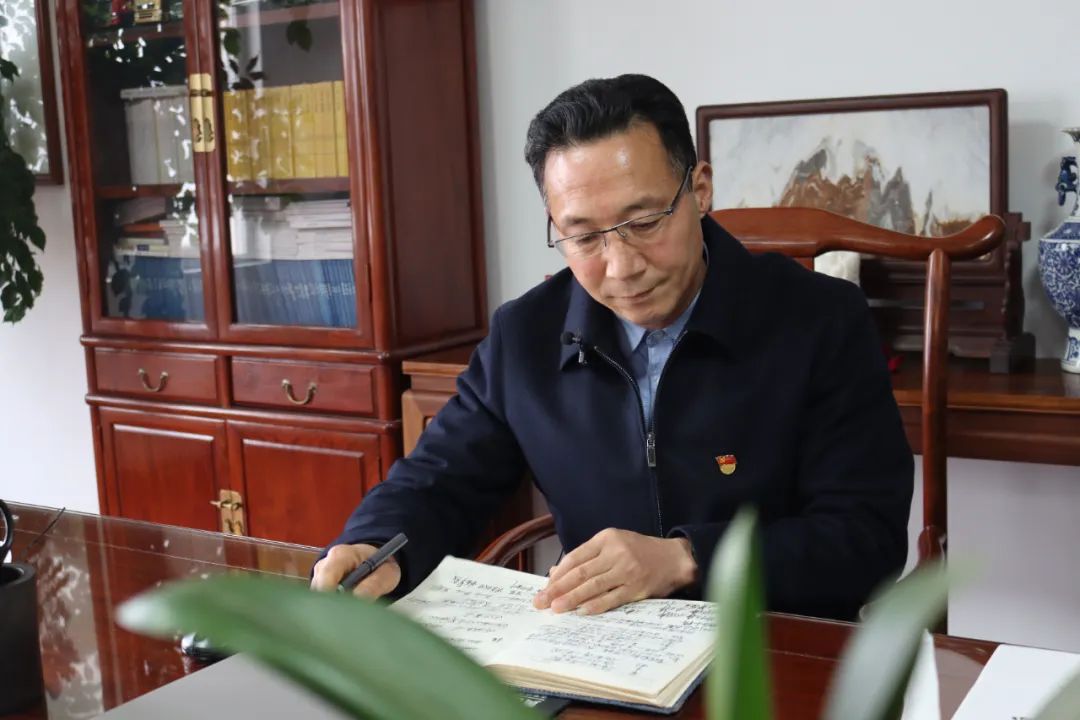 在他的办公室里,《利他心》《经营三十四问》《企业迷思》等众多书籍就在手边;一本已经掉皮的笔记本满是读书笔记和心得体会。