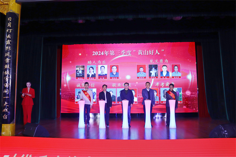 随后,揭晓了2024年第三季度“黄山好人”名单。颁奖仪式上,通过人物短片、现场讲述等方式展示了好人们的事迹。本次发布的“黄山好人”中,有无偿献血18年,用热血传递无声大爱的社区居民孙晖;奋不顾身跳入新安江勇救落水老人城管队员韩明坤;坚守诺言,三十三载如一日用心用情守护“国宝”的文物保护员胡晓雯;从警三十余载,忠诚初心永不改的基层民警李万山;17年不离不弃照顾高位截瘫丈夫的村民程秋好……他们是社会的好公民、单位的好员工、家庭的好成员,传播真善美、传递正能量。
