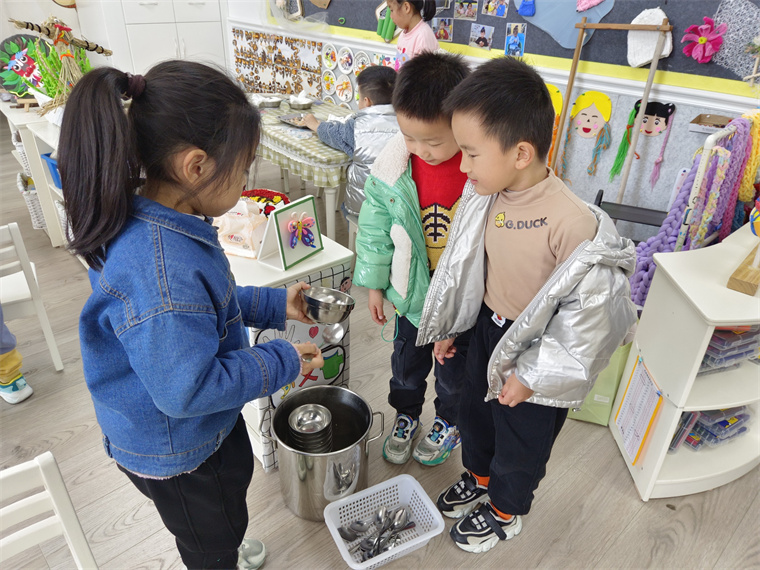 班级老师在进餐前运用游戏、讲故事等活动增强幼儿的进餐兴趣,改善幼儿的挑食现象。进餐时,采用按需取餐,对特殊幼儿调整进餐方式,鼓励幼儿做到碗盘、桌面、地面都干净。班级“小小监督员”轮流上岗,督促同伴每日光盘。