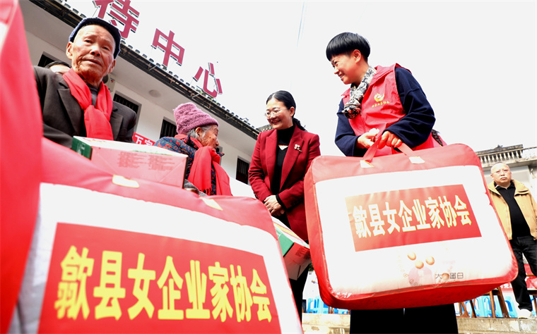 11月10日,歙县女企业家协会开展“女企老区行,棉被暖寿星”活动,20名女企业家行走岔口镇革命老区,在大坑源村开展给高龄老人、五保老人送棉被、送牛奶、送祝福,与老人促膝谈心拉家常,给老人送上初冬的温暖。