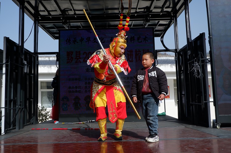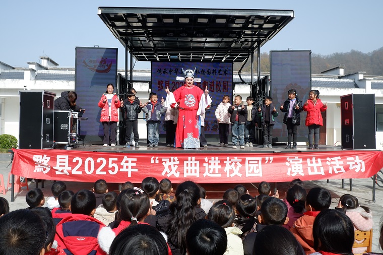 11月27日,黟县宏潭乡中心小学的校园里锣鼓喧天、好戏连台。黟县新丽黄梅戏剧团带着精彩的戏曲盛宴走进校园,以“导-师-制 ”特色模式开展“戏曲进校园”活动,川剧变脸、美猴王模仿秀等特色节目点燃孩子们的热情,上台学舞金箍棒、练黄梅戏经典动作与唱腔的互动环节,让大家在沉浸式体验中感受传统文化的独特魅力。