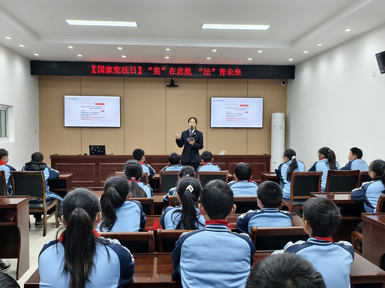 与此同时,社会导师、渔亭司法所所长李夏薇为渔亭学校初中部全体学生开展“我与宪法”主题讲座。她从宪法基础知识入手,结合生活中常见的违宪案例,用通俗易懂的语言讲解了宪法与日常生活的紧密联系,强调青少年“学法、知法、懂法、用法”是守护自身安全、健康成长的重要保障。讲座中,社会导师李夏薇所长通过“法律知识小问答”等互动形式,调动学生参与热情,让法治理念在问答中深化、在思考中扎根。
