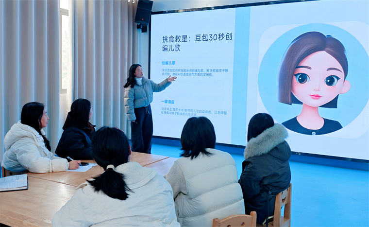 本次培训重点介绍了三类核心ai工具及应用场景。其一为豆包、deepseek等“万能智慧大脑”类工具,讲解精准提示词运用方法,通过教案生成、儿歌创编等实例,展示其减负增效作用;其二是“神奇画师”即梦ai,现场演示文字生成教学图片,解决教具素材痛点;其三是剪映、希沃等“虚拟助教”类工具,重点演示剪映提词拍摄、希沃课堂小游戏等适配幼教的功能。培训中还设置实操体验环节,帮助教师快速掌握工具使用,保障培训实效。