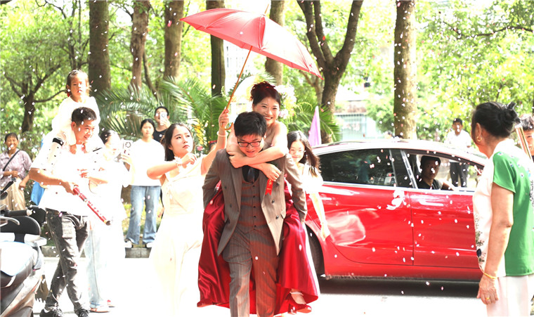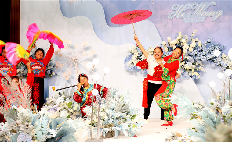 10月2日,歙县深渡镇绵潭村新娘汪梦雅和新郎何勇婚事新办,邀请北岸镇北岸村“起舞飞扬”舞蹈队为婚礼击鼓助兴,表演激情舞蹈增添热闹氛围,新娘自己主持婚礼,介绍夫妻在外地创业经历,倡导简约适度的婚俗礼仪,用简朴大方的方式增添婚礼仪式感,告别铺张浪费,倡导移风易俗婚嫁新风尚。