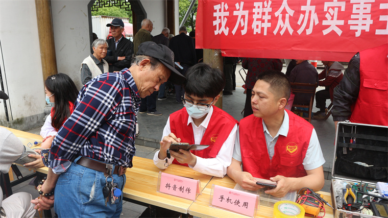 2022年团队在五福街社区服务时,针对社区老年人子女不在身边,平常智能手机使用不便的情况,特别推出智能手机教学、抖音制作教学两项服务。“徽骆驼”们身穿红马甲,熠熠生辉的这一抹志愿红深受社区老年群众信赖,将自己的手机放心交给我们操作。“徽骆驼”们本着热心、耐心、细心,真诚为老年人们讲解,把志愿服务落到细微之处,把温暖送进百姓心坎,用实际行动诠释了社会责任与担当,赢得了群众的赞许。