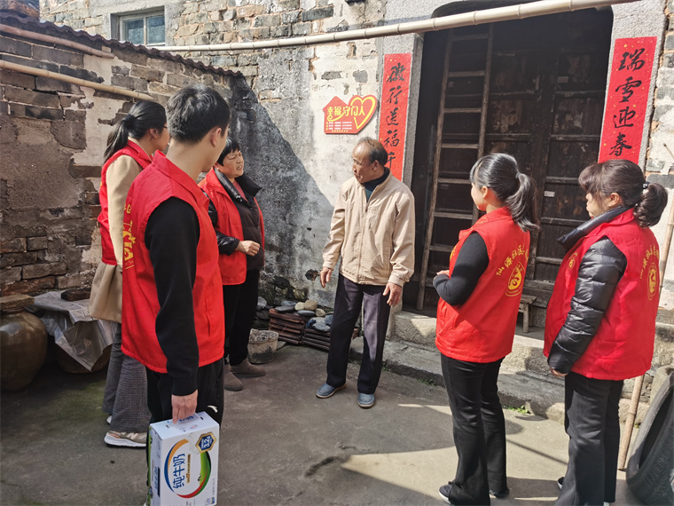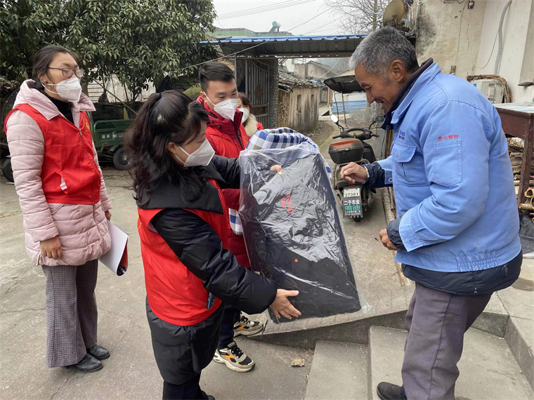 图为春节期间志愿者走访空巢老人,送上棉衣棉被