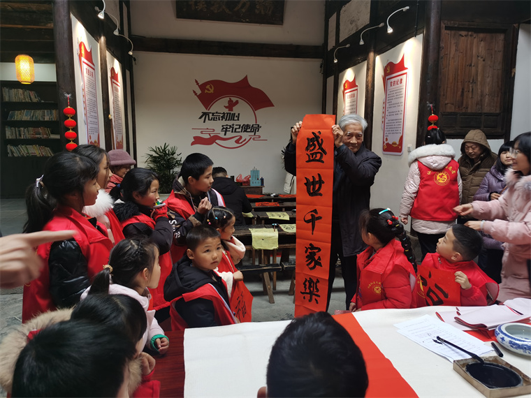 图为空巢老人教留守儿童书法