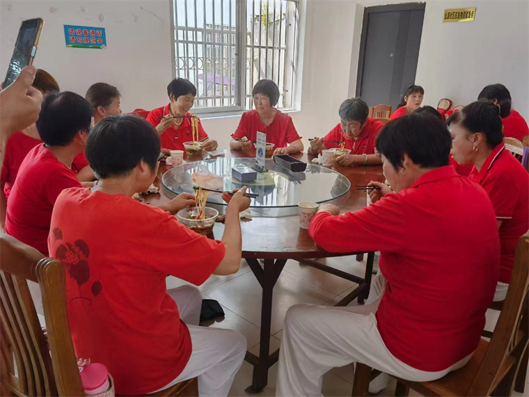 图为组织辖区内空巢老人同吃长寿面,共度重阳节