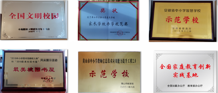 黄山市实验小学秉承“承徽州文化,做阳光少年”校训,紧紧围绕文明校园“六好”标准,全力推进创建工作,成效显著。学校先后荣获国家级荣誉3项:全国文明校园,全国家庭教育创新实践基地,创建全国文明校园先进学校;省级荣誉8项:省“文明校园”,省“绿色学校”,省家长学校办学规范奖,省“电教先进集体”,省“优秀少先队集体”,省首批“中小学智慧学校示范校”,省“少儿科技研究实践基地”,省“最美校园书屋”;市级荣誉近30项。
