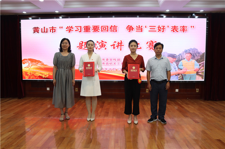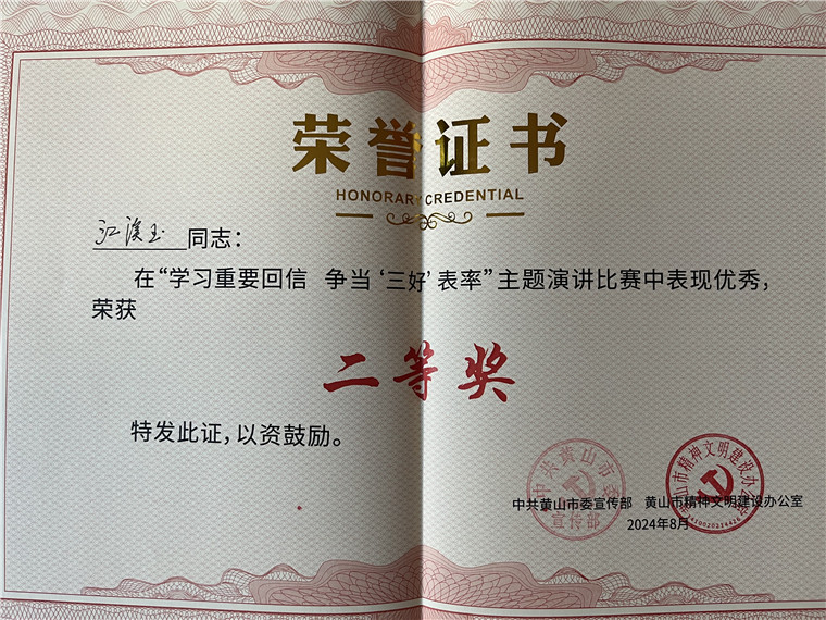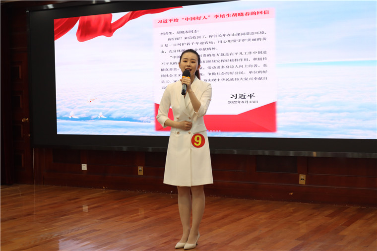 8月13日上午,黄山市“学习重要回信 争当‘三好’表率”主题演讲比赛在黄山市税务局多功能厅圆满落幕,来自全市的18位选手参加比赛。歙县选手江溪玉以其真挚的情感和精彩的演讲,荣获本次比赛的二等奖。
